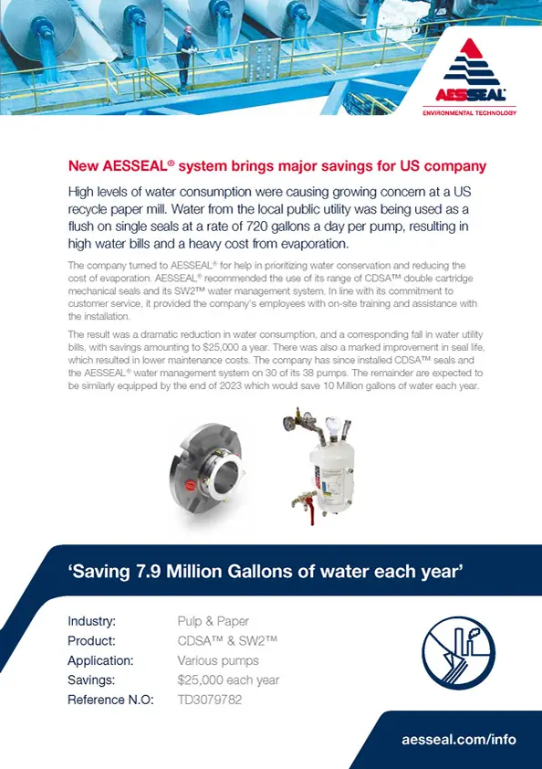 High levels of water consumption were causing growing concern at a US recycle paper mill. Water from the local public utility was being used as a flush on single seals at a rate of 720 gallons a day per pump, resulting in high water bills and a heavy cost from evaporation.