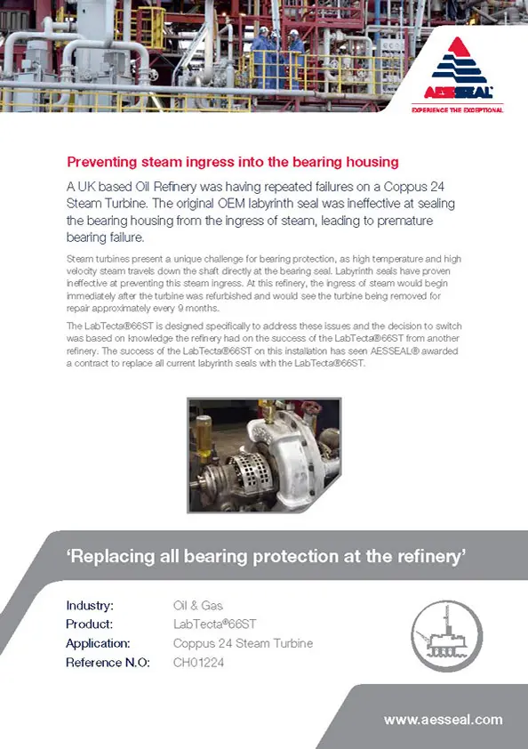 A UK based Oil Refinery was having repeated failures on a Coppus 24 Steam Turbine. The original OEM labyrinth seal was ineffective at sealing the bearing housing from the ingress of steam, leading to premature bearing failure.