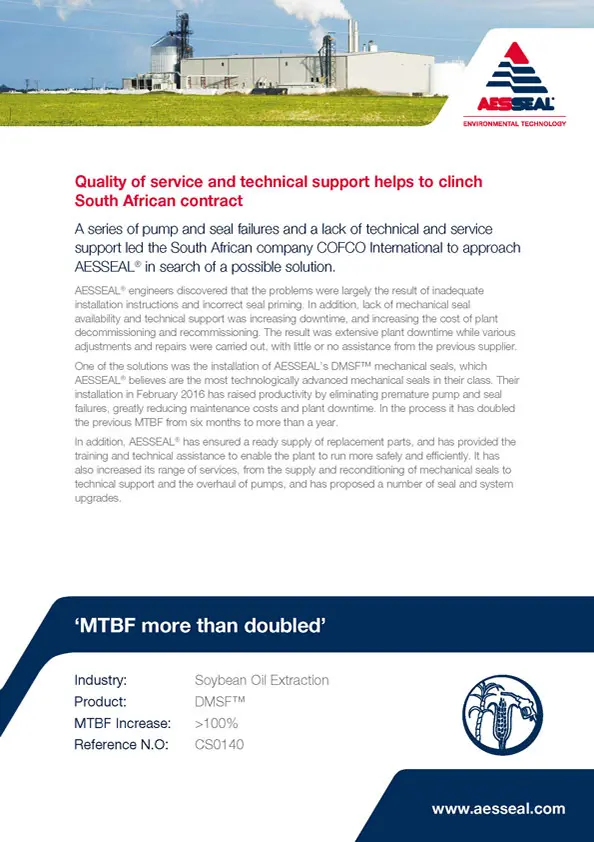A series of pump and seal failures and a lack of technical and service support led the South African company COFCO International to approach AESSEAL® in search of a possible solution.