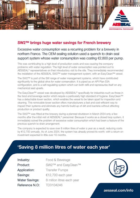 Excessive water consumption was a recurring problem for a brewery in northern France. The OEM sealing solution used a quench to drain seal support system whose water consumption was costing €2,800 per pump.
